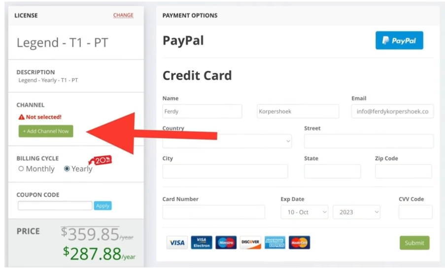 After you select the Legend Plan, you need to link your YouTube Account and fill in your credentials. You can pay with PayPal and a Credit card
