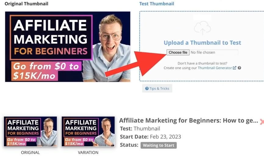 Upload the second thumbnail that you created for the Split Test. Do you yet have to create a thumbnail? You can follow this guide on how to do that using TubeBuddy.